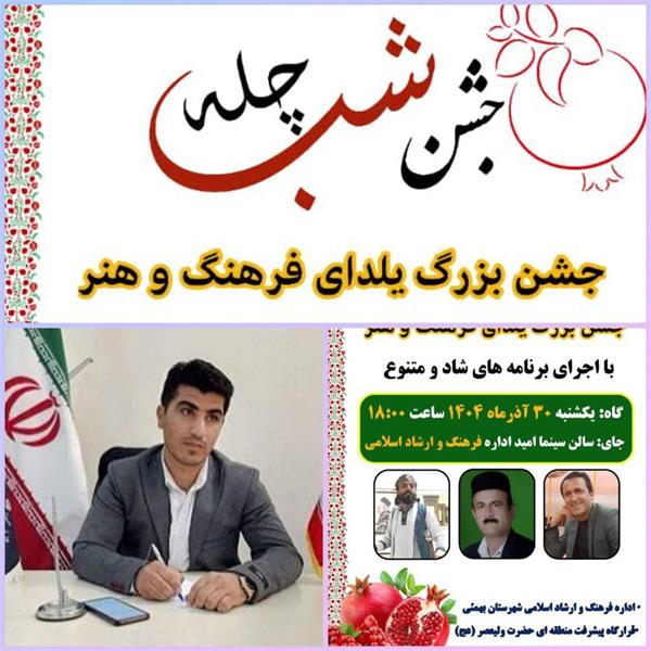 رئیس اداره فرهنگ و ارشاد بهمئی اظهار داشت: به مناسبت شب یلدا در تاریخ یکشنبه ۱۴۰۴/۰۹/۳۰ ساعت ۱۸:۰۰ در سالن سینما امید اداره فرهنگ و ارشاد اسلامی جشن یلدا با اجرای برنامه های شاد و متنوع از قبیل تئاتر، موسیقی، مسابقه، شعرخوانی و نقالی برگزار خواهد شد.