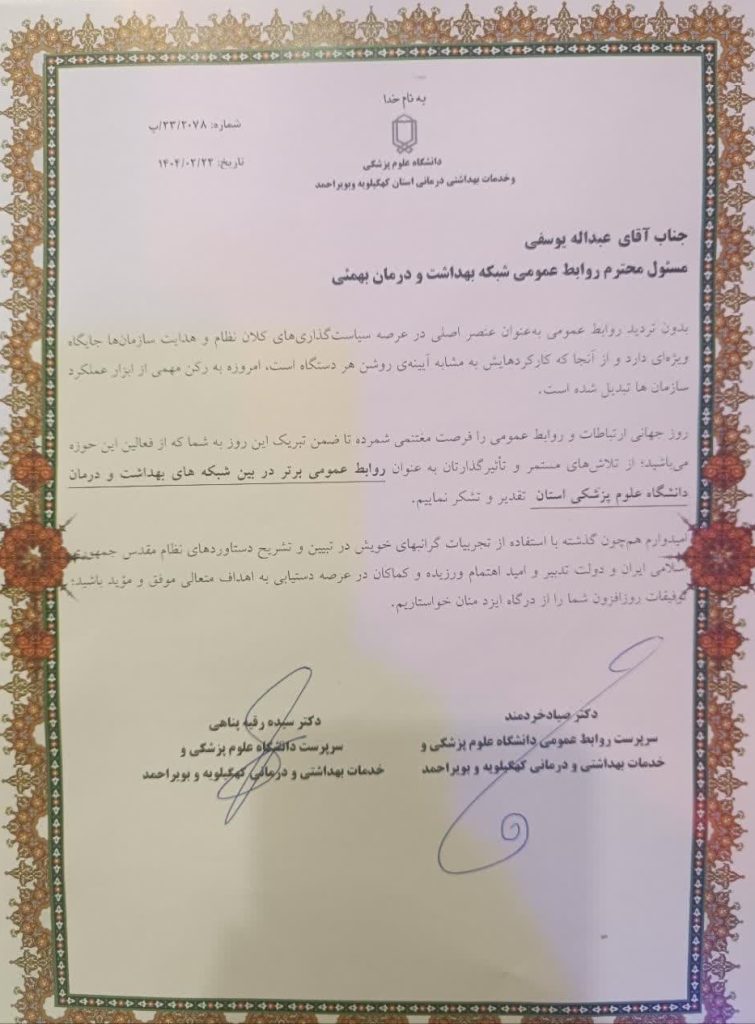 در این مراسم، از عبداله یوسفی، روابط عمومی شبکه بهداشت و درمان بهمئی، به دلیل عملکرد قابلتوجه و کسب امتیاز برتر در حوزههای مختلف تقدیر به عمل آمد.
