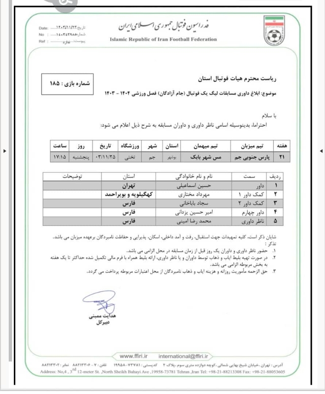 آفتاب زاگرس ،مهردادمختاری جوان شایسته شهرستان بهمئی درلیگ یک بازی فوتبال بین تیم های پارس جنوبی جم ومس شهربابک کمک اول را قضاوت خواهد کرد.