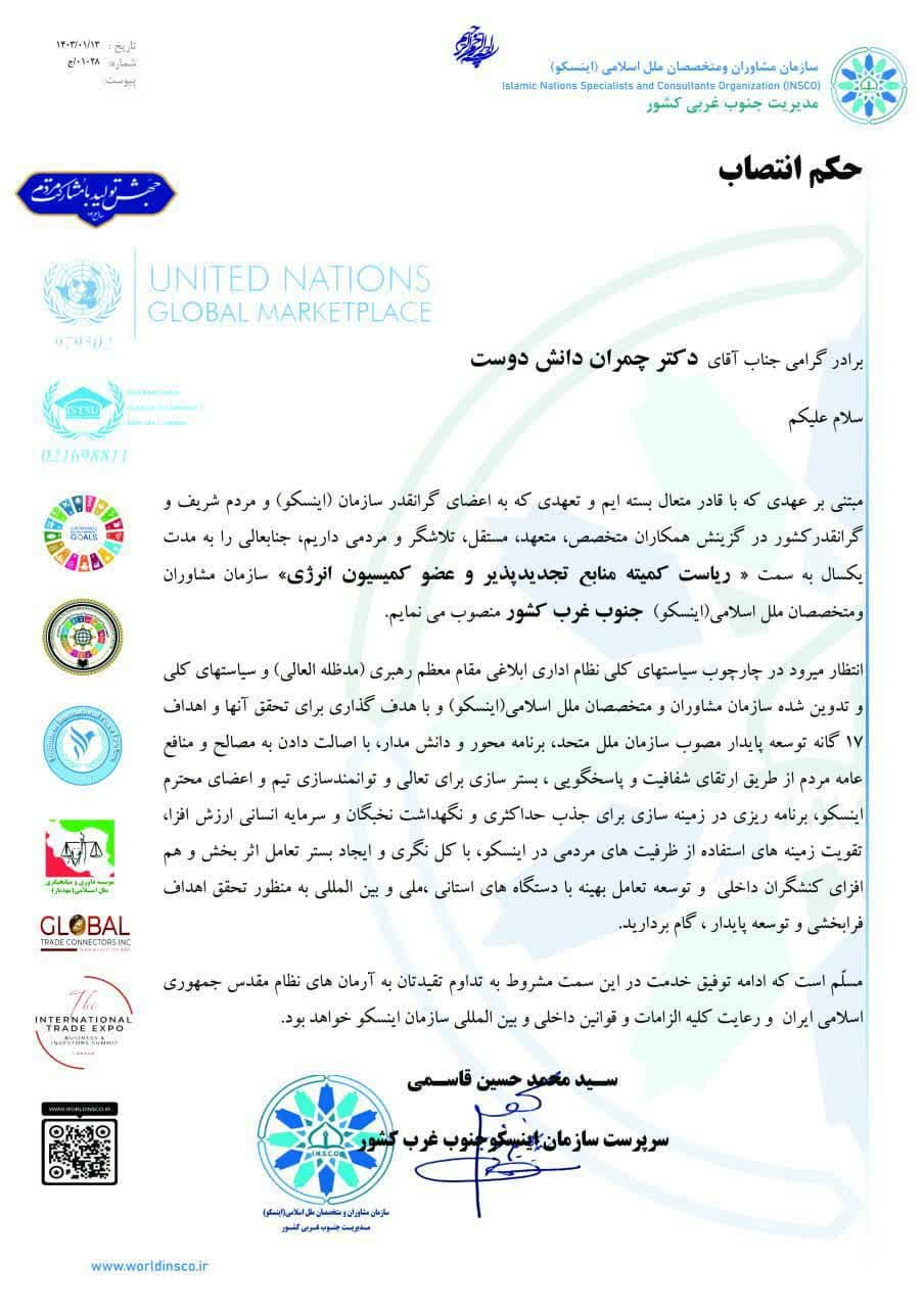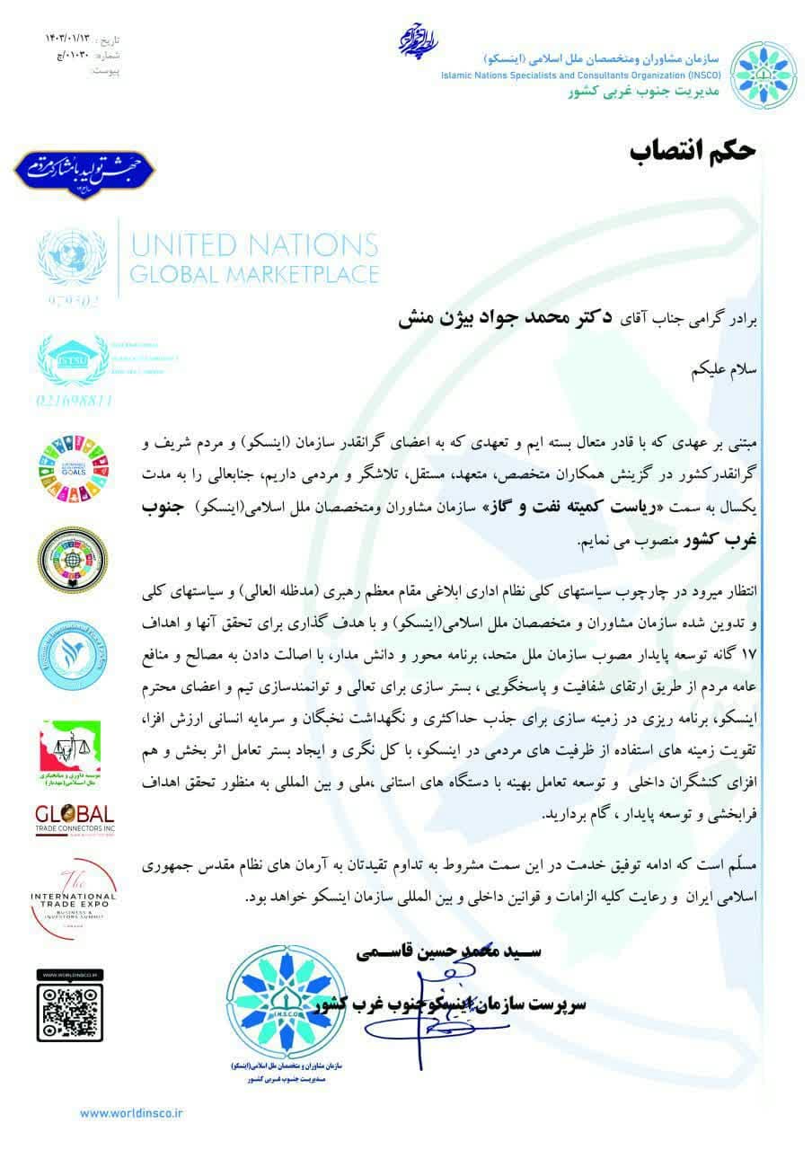 آفتاب زاگرس؛ طی احکامی از سوی سید محمد حسین قاسمی سرپرست سازمان مشاوران و متخصصان ملل اسلامی(اینسکو) منطقه جنوب غرب کشور روسای کمیته پزشکی ،نفت و گاز و منابع تجدید پذیر و عضو کمیسیون انرژی منطقه جنوب غرب کشور(فارس، بوشهر و کهگیویه وبویراحمد) معرفی شدند.